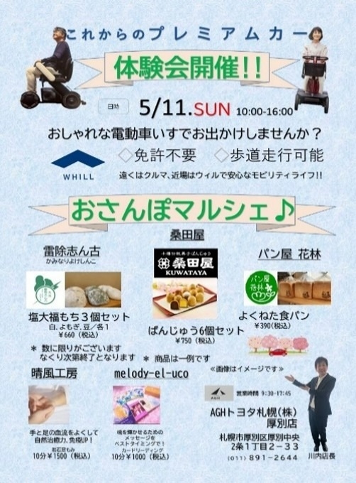 2025年5月11日、AGHトヨタ札幌 アンビシャス厚別にて「電動車いす体験会+おさんぽマルシェ」を開催しました。